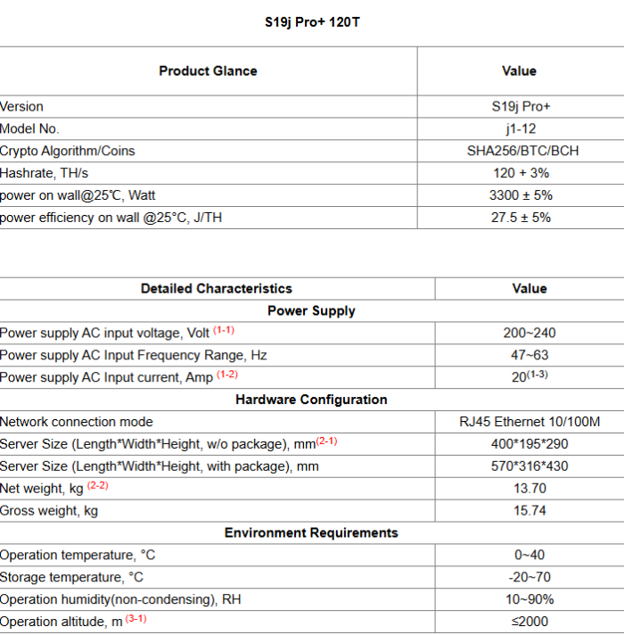 Specifications, computing power consumption, power supply, usage environment and other related information of S19j Pro+ are shown in the tables below