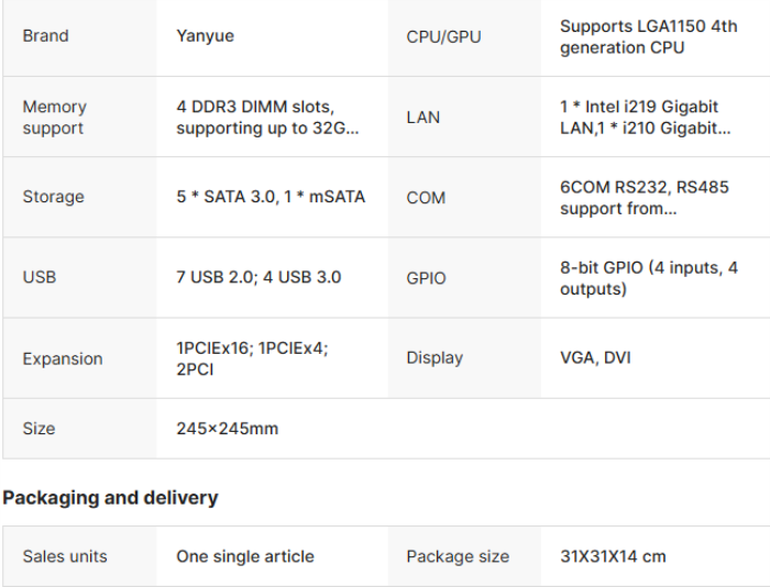 Micro ATX motherboard with Intel B85 chipset , compatible with 4th generation Intel Core processors, up to 32GB DDR3 memory , dual Gigabit LAN ports, VGA/DVI output, 6 COM ports, and expansion slots including PCIe x16. It features 8-bit GPIO, 7 USB 2.0 ports, 4 USB 3.0 ports, and a wide operating temperature range of -15 to 55°C for reliable performance.